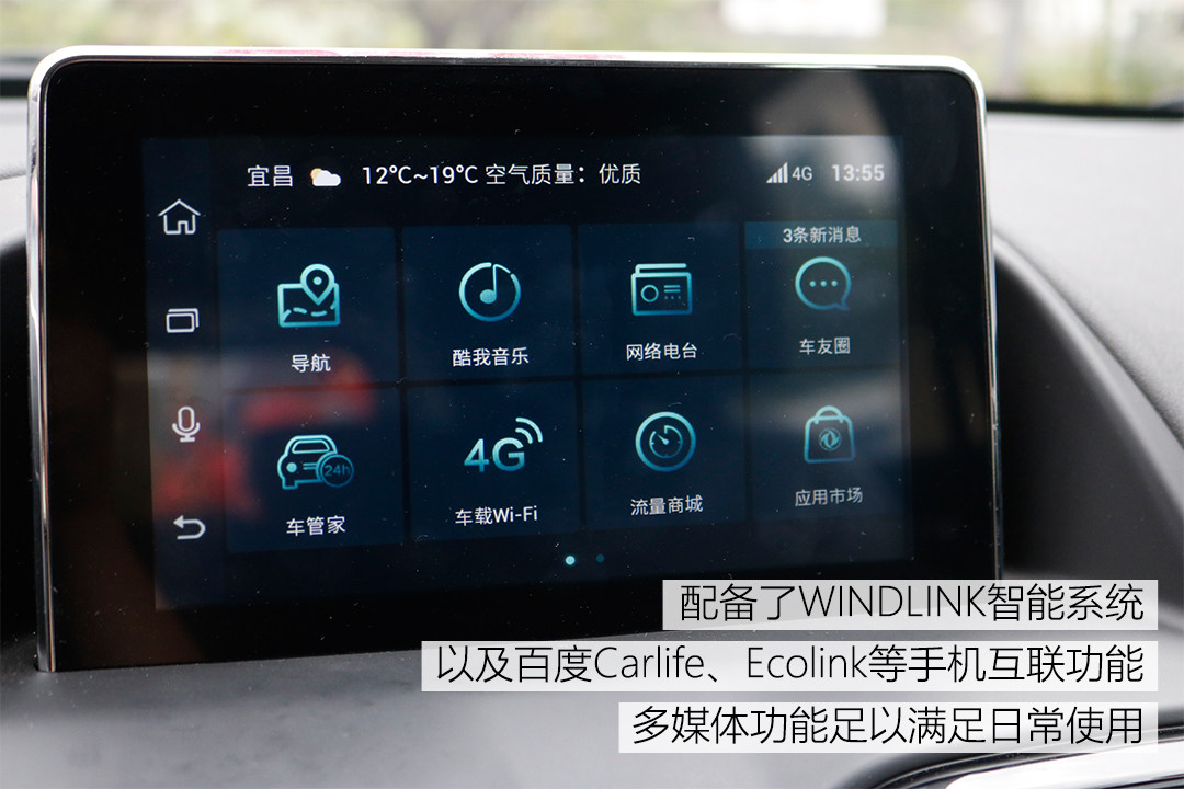 多媒体系统是AX4为了迎合年轻人使用习惯的一大卖点,配备了WINDLINK智能系统,支持在线音乐、在线导航等功能,而且AX4车主每年都会获赠12G的免费流量,相当人性化。另外也支持百度Carlife,可以通过手机来拓展更多的功能,让年轻人在车上也不至于太无聊。