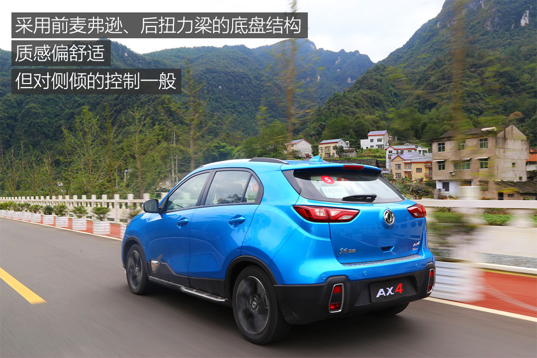 底盘方面,AX4的后悬挂采用了常见的扭力梁式非独立悬架,整体调校偏向于舒适性的取向,路面的细碎震动传递到车厢的时候都会变得相对柔和,舒适性好评。但AX4的底盘调性不利于激烈驾驶,它对侧倾的控制不会十分强,操控的信心有限,更适合安安分分地驾驶。