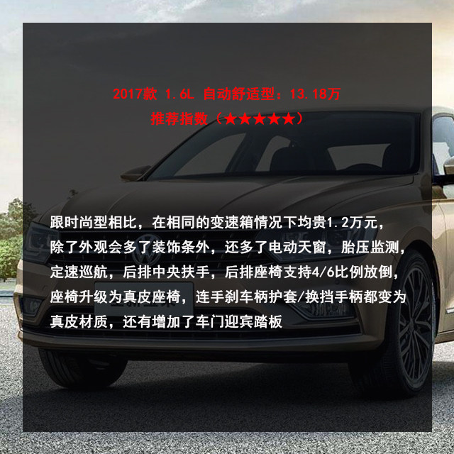 这两款搭载涡轮增加发动机的推荐车型,咱们就不一一细说了,相同版本下的配置是一样的,价格方面,1.6L车型跟1.4T车型在相同版本下的差价都是一万块钱,基本符合目前市场上的差价,至于选择谁,那就好说了,想要动力高点的就选择带T的,对动力要求不高那就选择自吸车好了,毕竟自吸车的发动机寿命相比涡轮机来说会高点。