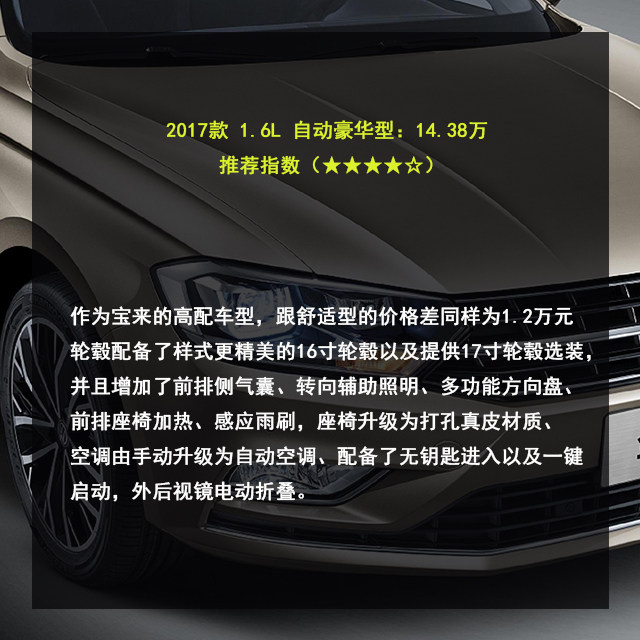 自动豪华型,宝来的最顶配车型,价格当然也是最高的。虽然价格相比舒适型要高出个1.2万,但是能得到的舒适性和便利性配置的提升也不少,自动空调、前排座椅加热、外后视镜电动折叠、无钥匙进入以及一键启动这些配置都是豪华版车型的最大卖点。对于手头富裕点的,对生活追求高的准车主来说,豪华版车型还是物超所值的。
