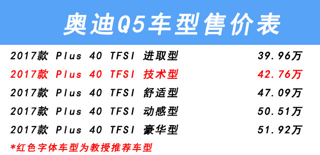 动感型是在Q5车型中是一个比较特殊的车型,配置基本与舒适型相当,增加了可变悬挂和可变转向比,还有运动包围和运动座椅等,外观肯定很帅,但是指导价格也突破50万了,即使有大优惠,教授也觉得性价比偏低,只给两星推荐,喜欢运动风格的可以考虑。