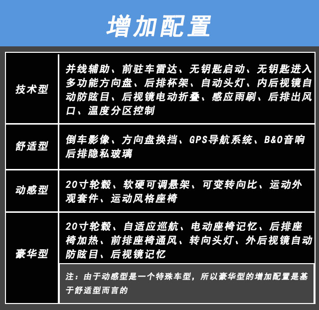 表中列出了每个车型的增加配置,只是增幅一般,不过基于低配进取型配置比较齐全,可以接受。下面就看下教授的车型分析及推荐吧。