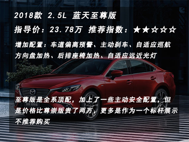总结:阿特兹一直以来叫好不叫座,现在2018款上市,马自达更加良心了,加量不加价,让阿特兹的综合实力和竞争力更上一层楼,销量值得期待。要购买阿特兹的小伙伴,最佳性价比车型首选2.0L 蓝天豪华版。