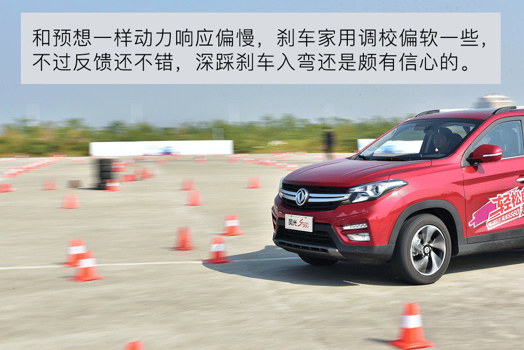 首先是刹车,脚感还不错,家用调校偏软一些,所以入弯的时候要提早一些踩刹车,大力踩刹车的反馈不错,至少体验赛道的过程中是有信心的;其次就是动力响应,就如前面所说,这并不是一套追求动力的组合,所以在出弯弯心的时候深踩油门,动力响应略慢(变速箱S挡模式),这其中与CVT变速箱密不可分,如果换作是一套双离合变速箱的话,动力来得会更干脆一些;最后提一点就是,风光S560的坐姿挺高的,开车的视野比较开阔,而在车辆四周的包围处盲区比较大,因为试驾场地都是小的雪糕桶,围起来的赛道也比较窄,所以很多时候压着内弯跑总觉得会压到雪糕桶,然而实际情况还是有不少余位的。
