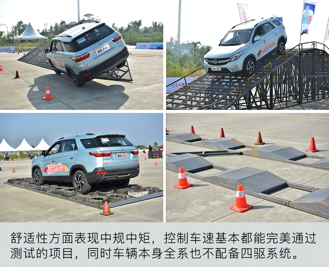 侧坡、陡坡、起伏路等几个体验舒适性的项目,风光S560的整体表现还算满意,控制车速基本都能完美通过,没出现过轮胎打滑和磕到底盘的情况出现。后悬架为扭力梁式非独立悬架,受制于成本问题,同级别车型中都是采用这一形式,风光S560的出彩之处还是集中在配置上。