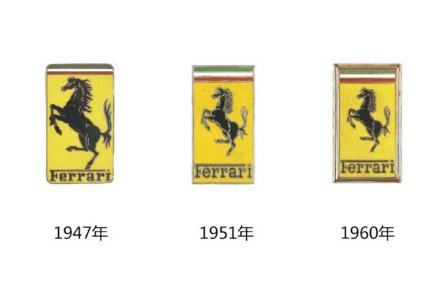 那时候的徽章还是一个盾牌形状,上面有三条绿白红条纹,象征着意大利,盾牌上有一个来自巴拉卡伯爵夫妇的马,不过姿态相比以前更加优雅。而黄色则来自恩佐·法拉利的家乡摩德纳。