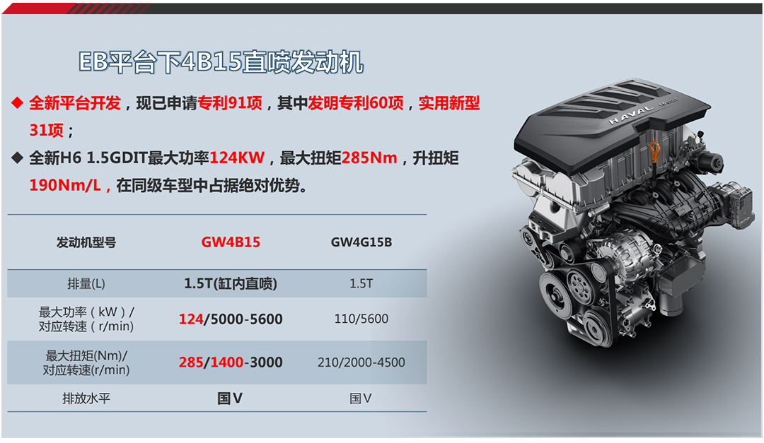 这副全新的1.5 GDIT发动机拥有1.5L排量,采用涡轮增压的进气方式,并且搭载了缸内直喷技术。发动机的代号为GW4B15,是老款哈弗H6搭载的GW4G15T的换代产品。
