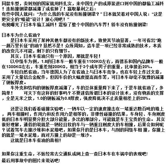 国家政治问题我们不要考虑,就说日车在技术上还是在国际前茅的高比韩国,在说现在的车不是要求钢板有多么厚,卡车撞宝马绝对宝马惨!要求的是动力节油操控舒服安全,已大的冲击力用车自身电子安全配置与车架物理缓解技术达到小的冲击力减少重大事故