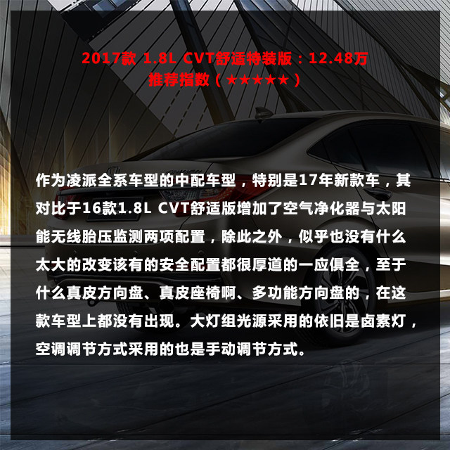 同样是17年新上市的特装版,跟舒适型一样,增加了配置但是价格没变。也算是非常厚道了,豪华版车型在凌派来说只能算是中配车型,但是较舒适型车来说,多了很多实用的配置,可以说多花这1万块钱换来的配置以及能享受更好的驾乘感受还是非常不错的。