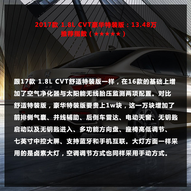 2017款 1.8L CVT豪华特装版:13.48万