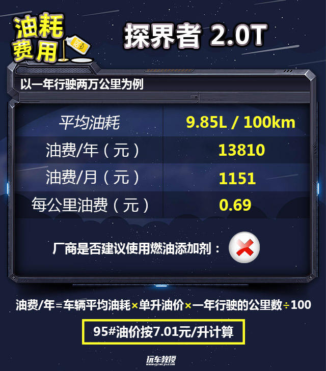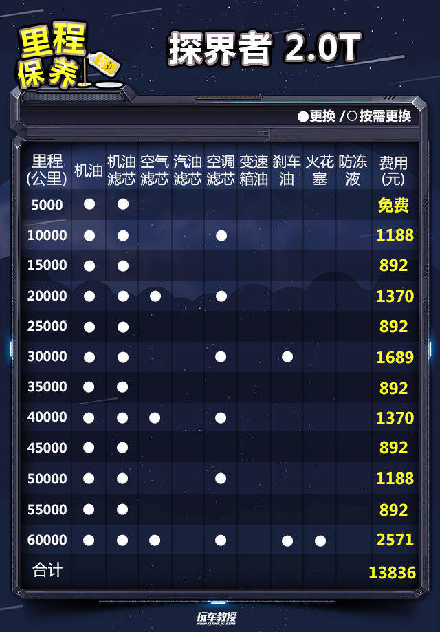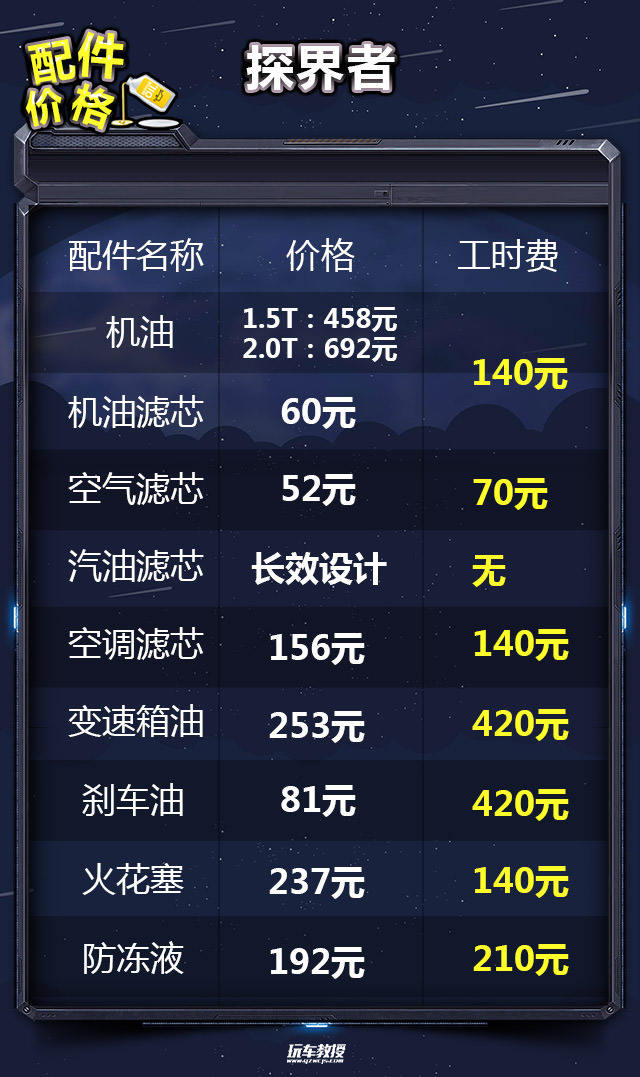 教授总结:从保养的结果上看,探界者小保养的价格为1.5T车型658元,2.0T车型892元,价格表现正常。行驶6万公里保养总费用,1.5T车型为10759元,2.0T车型13836元,费用与昂科威并无太大的差异。即使使用了全合成机油,但是保养间隔依然为5000公/次,这也是其保养费用贵的主要原因。按照一年两万公里计算,1.5T车型年花费22978元,月花费1915元;2.0T车型年花费27501元,月花费2292元。整体的养车费用比昂科威要便宜一千元左右,加上售价比昂科威低,探界者还是非常值得入手的。
