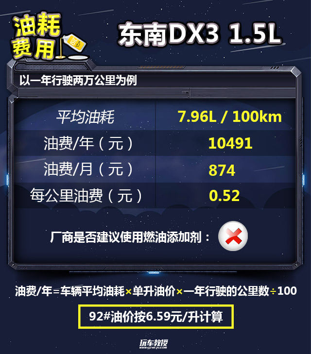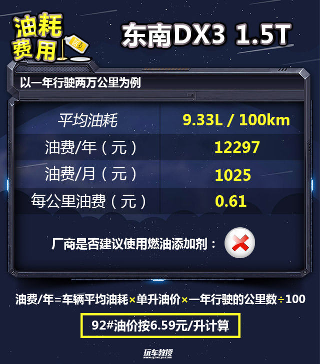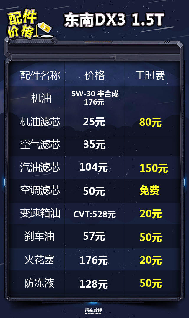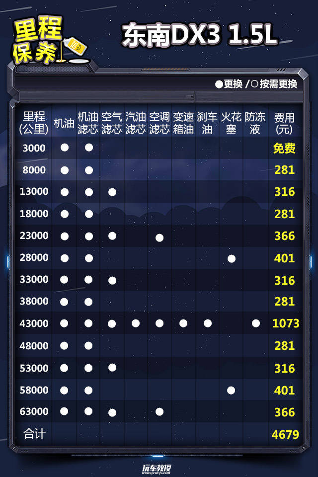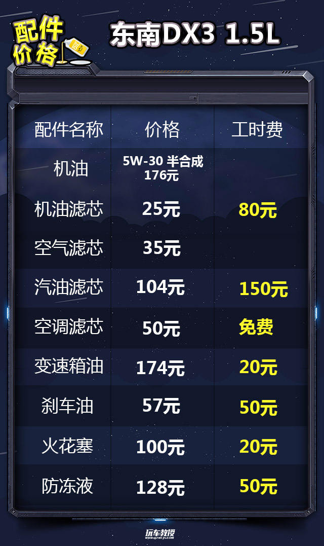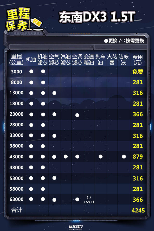 教授总结:从保养上看,东南DX3的小保养价格都为181元,行驶6.3万公里常规保养费用为1.5L车型4679元,1.5T车型4245元,处于中等水平。1.5T车型要比1.5L车型的保养费用要低,主要原因是火花塞以及变速箱油更换周期有差别。总的养车费用方面,1.5L车型的年花费要比1.5T车型便宜2100元左右,整体的花费处于同级别中等水平。