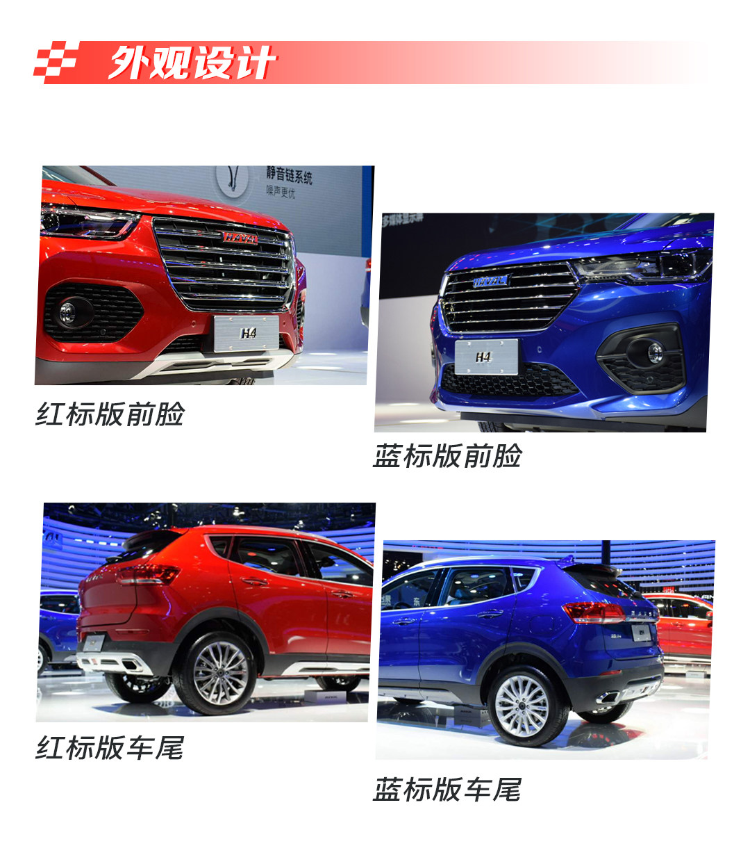 蓝标版尾部比红标版多一条贯穿尾灯的镀铬饰条,而红标版的尾部下方则比蓝标版多了一个银色护板,两车尾部差距不大,整体风格主要定义在前脸;就外观来看,哈弗H4给人的感觉是既有哈弗H2的时尚气息,也有哈弗H6的沉稳气场。