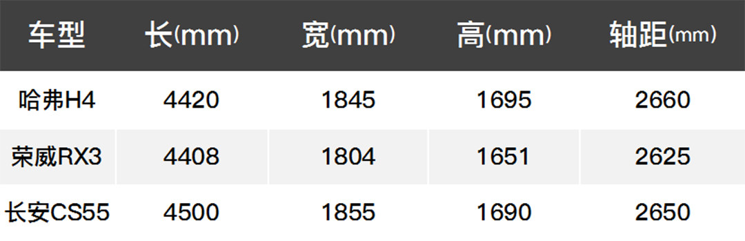 哈弗H4上市后弥补了H2和H6之间的对空间有更精确要求的市场,觉得H2太小,H6又太大的消费者来说,H4无疑是最好的选择,那么我们根据H4的尺寸来预计上市后面对的竞争车型将有可能是长安CS55和荣威RX3。