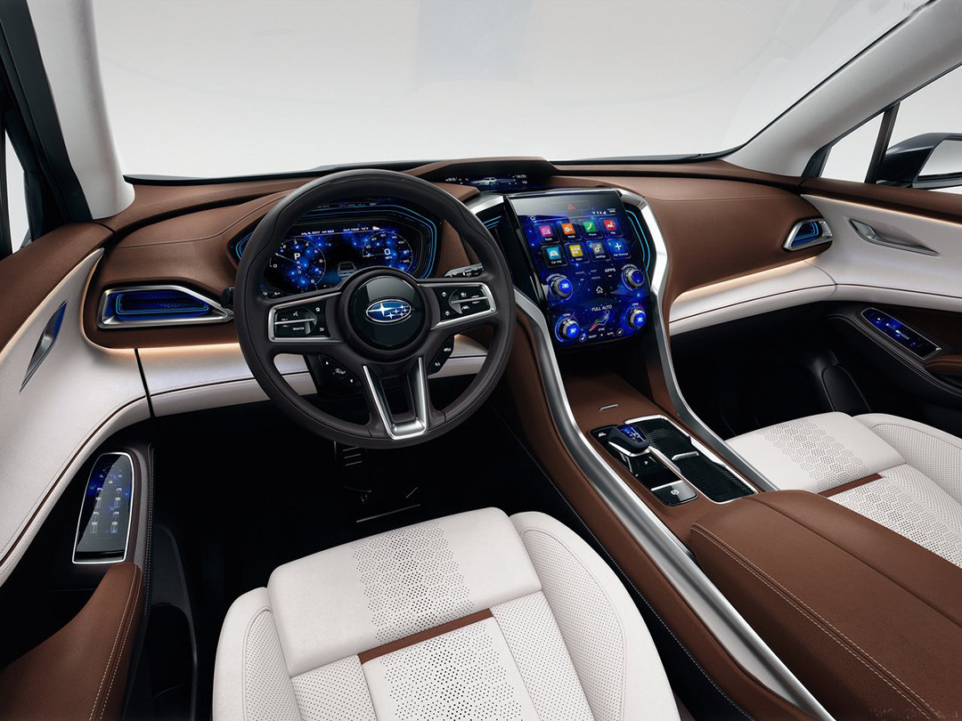 全新Ascent的内饰造型依然延续了时下斯巴鲁的设计语言,不过整体也做了不少的调整。相较于森林人、XV,Ascent采用了集成众多功能的大尺寸中控触控大屏,显得更为简洁。其次棕白色的内饰配以大面积的皮质包裹,呈现出很好的档次感;这也是它有底气把途昂作为对手的原因。不过以一姐试过多款斯巴鲁车型来看,它的内饰填充一直显得有些空洞,希望全新Ascent可以有所提升。