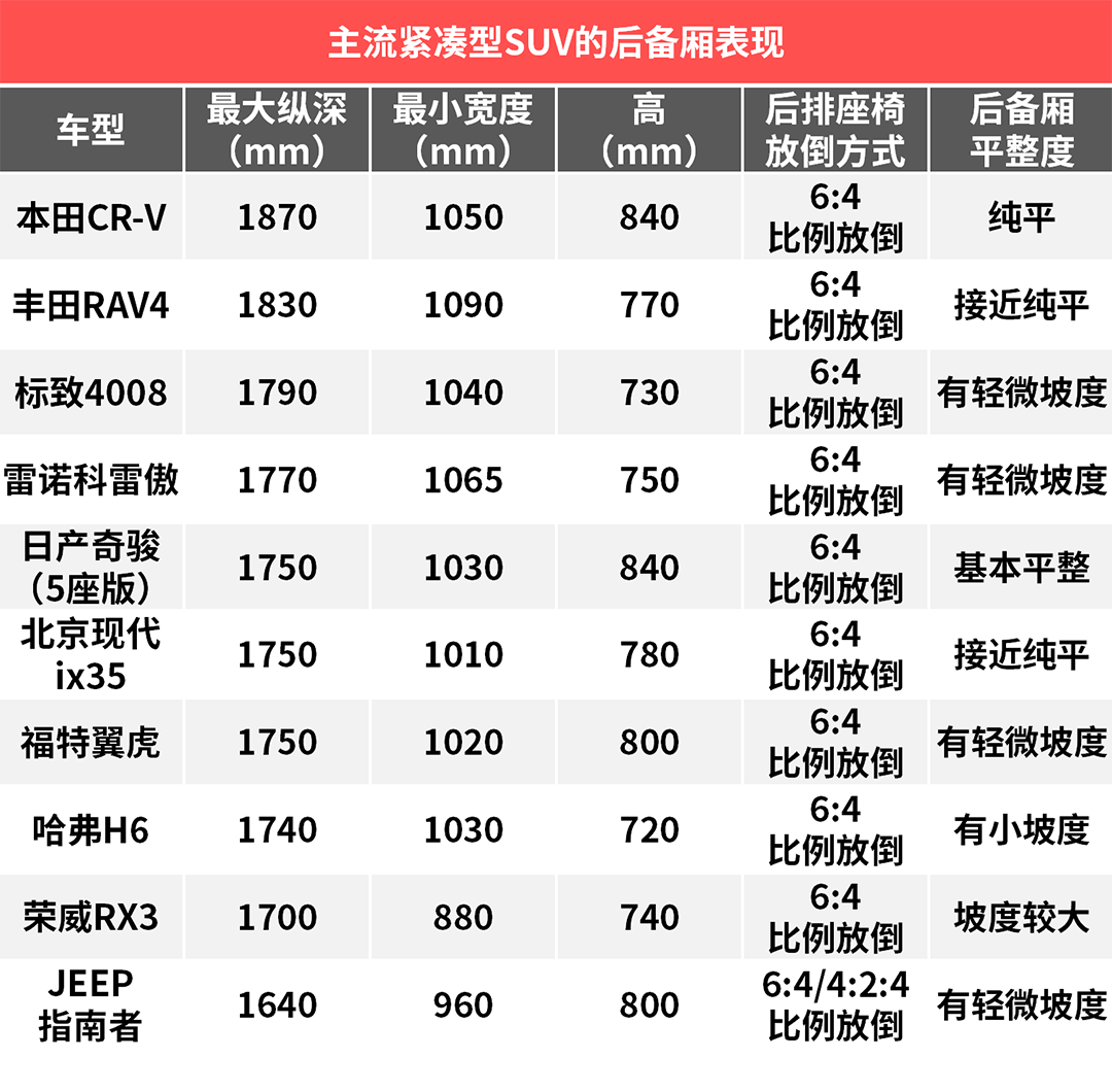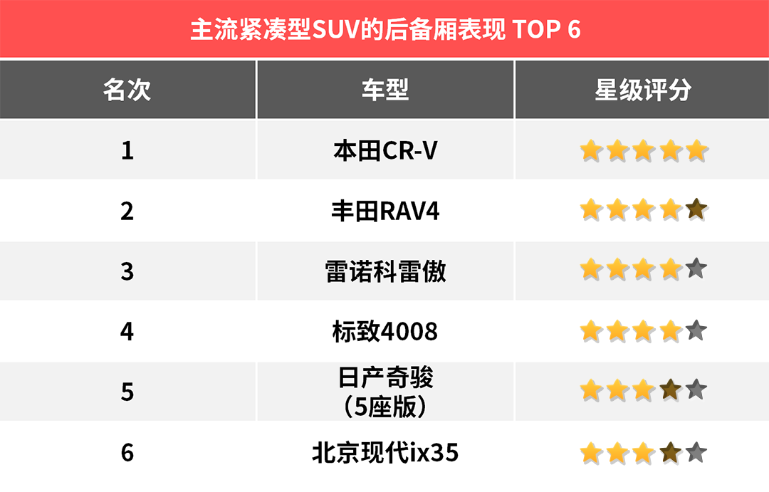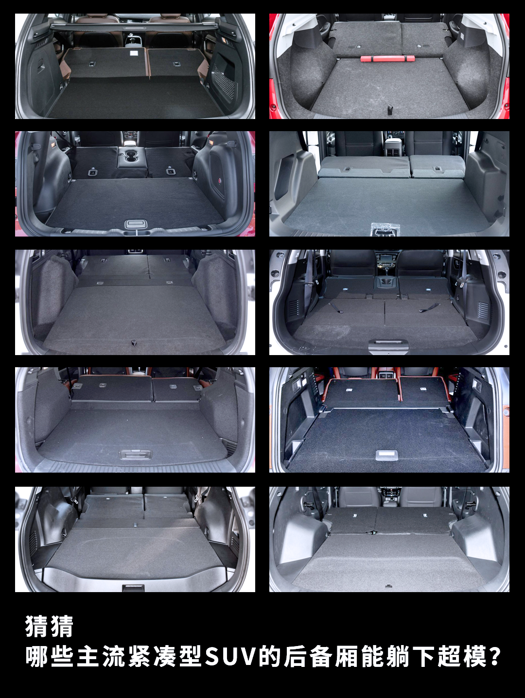 其实前6名的紧凑型SUV都有着相对出色的后备厢表现。但如果真的要躺下超模(说到有超模愿意躺后备厢一样…),那最优选就非本田CR-V莫属了,RAV4荣放的后备厢离地距离会相对偏高,方便程度会有所下降。至于排到倒数的荣威RX3的后备厢地板不太平整,指南者的后备厢尺寸相对寒酸了。大家如果很重视后备厢表现的话,真的要看清楚再买了哦~