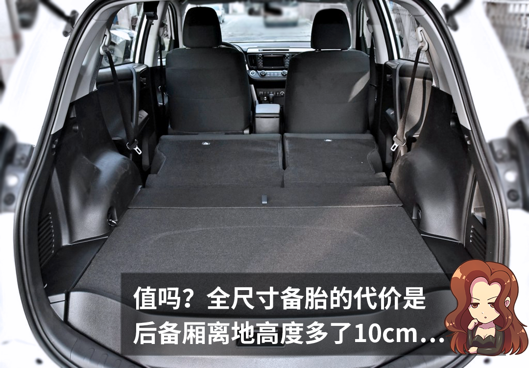 RAV4荣放的后备厢躺下一个超模是妥妥的事儿。最大纵深约1830mm、最小宽度1090mm、接近纯平的后备厢,都是它有力的条件。但无论是18款新增车型,还是16款车型都存在后备厢凸起现象,也导致了后备厢离地距离较大,这或许就是有着全尺寸备胎的代价吧。