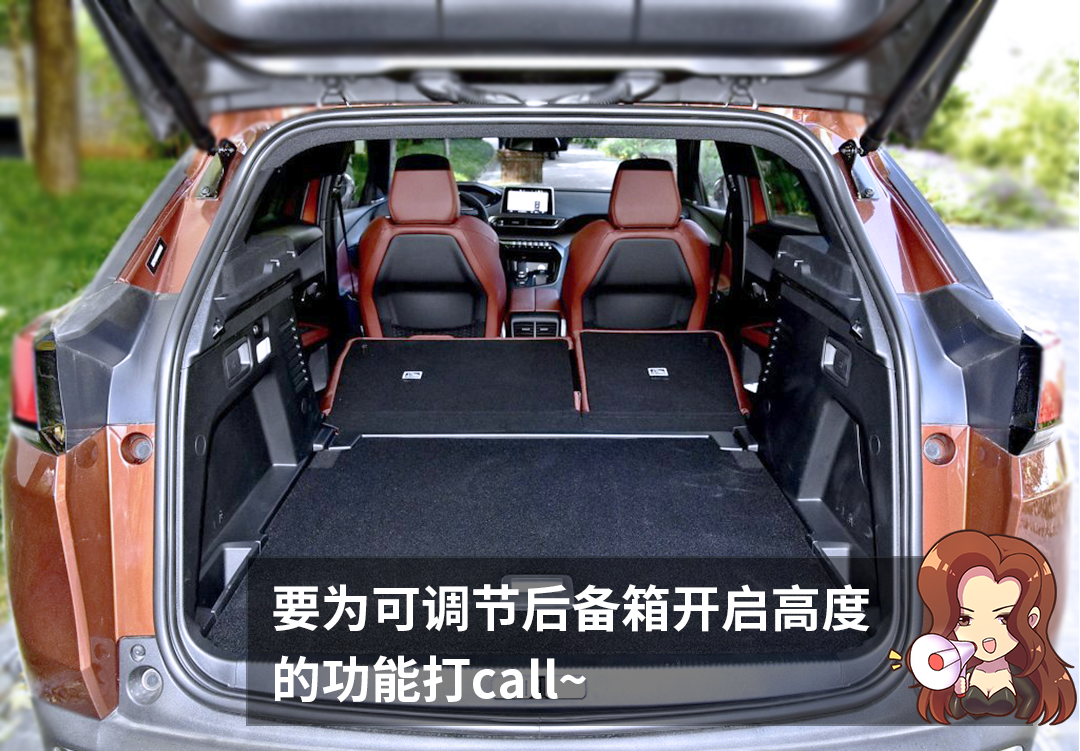 虽然标致4008的后备厢平整度不及前面两款车型,但是整个后备厢空间还是比较规整的,左右两侧没有过于明显的凸起。更令人欣喜的是,电动后备厢带有感应功能,更有自行调节后备箱开启高度的功能,真的十分贴心。