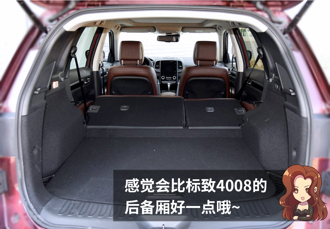 科雷傲的后备厢尺寸与标致4008差别不大,而且同样存在轻微坡度的问题,同样有可固定任意开启幅度的电动感应后备厢。不过科雷傲后备厢的地板下还暗藏玄机,分了两层,第一层是工具盒和储物格,第二层放的是备胎。储物功能还是不错的~