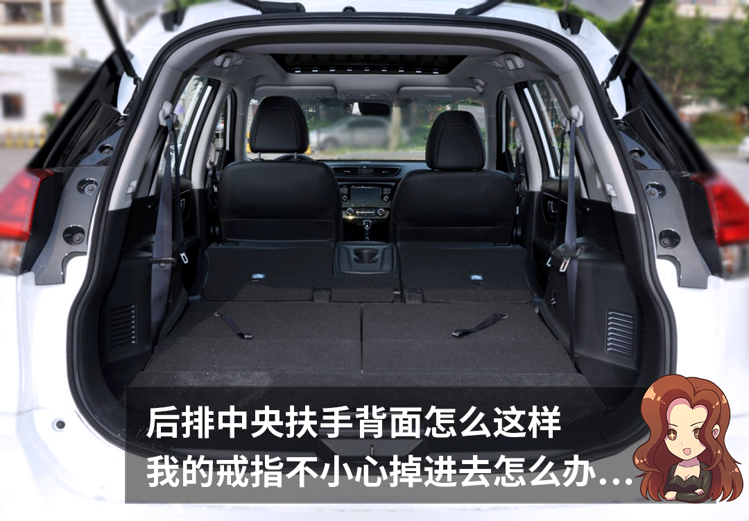 奇骏的最大纵深只有1750mm,躺下一个超模已经有点勉强了,但是奇骏的后备厢高度还是很不错的,有840mm,跟本田CR-V差不多。特别要提一下的是,奇骏的后备厢底板是可拆卸的,并且能充当隔板。如此一来,后备厢的可利用率就提高了不少。