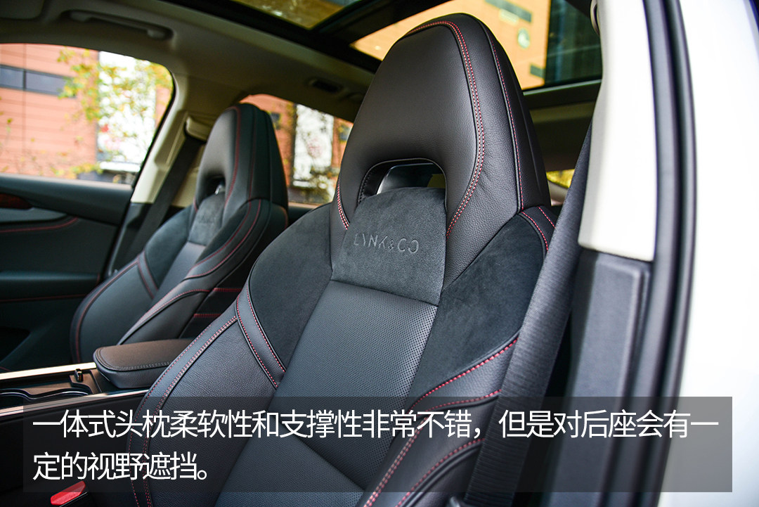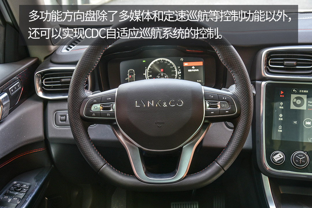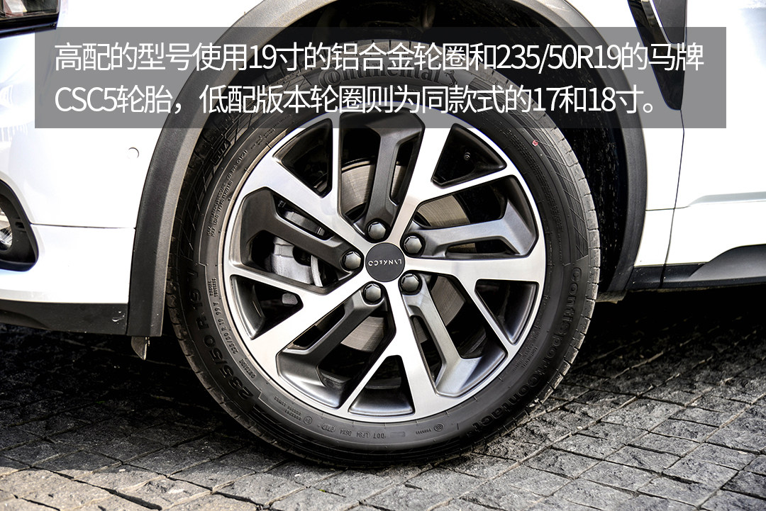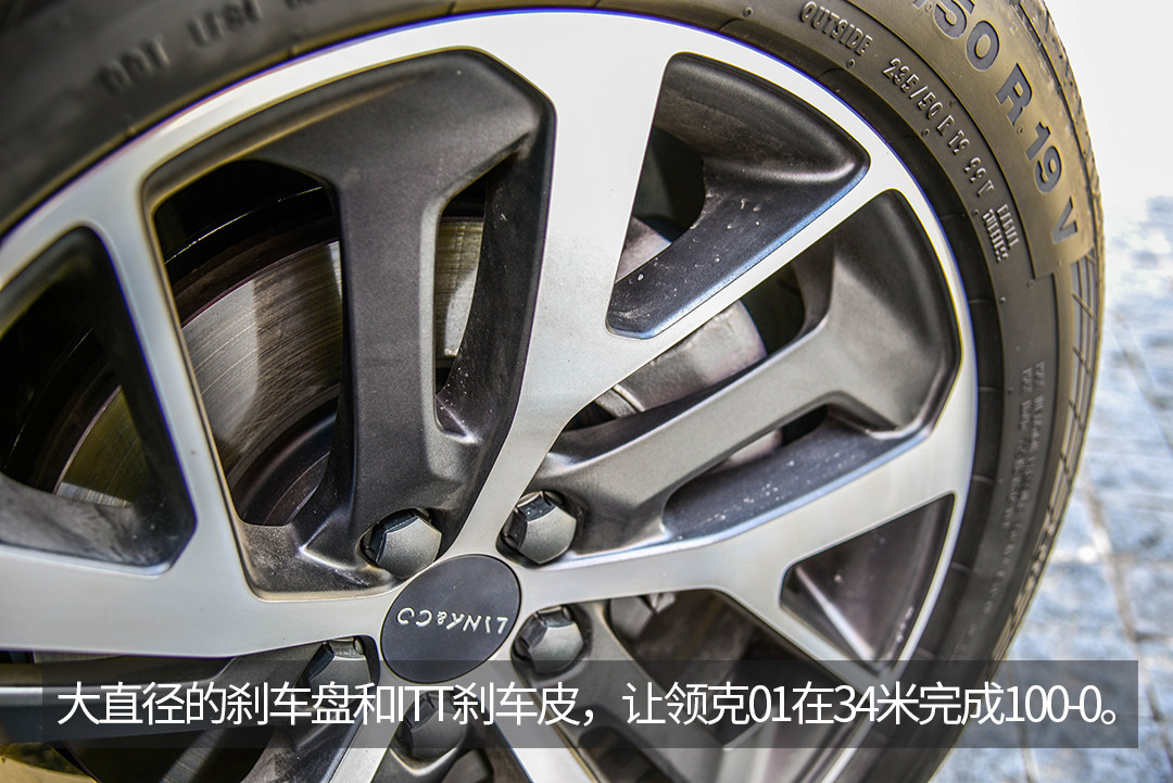 不过说操控前先说说舒适性,这也是大部分购车人士最急切了解的部分。领克01的顶配型号使用一条尺寸达235/50R19的马牌CSC5 SUV轮胎,磨耗系数420,外径为717.6mm,尺寸较大。因此对于一般的路面的小颠簸在大尺寸轮胎面前对车身舒适性也没什么影响的了。而在一般城市路面驾驶常见的路况和一些较大的坑洞,避震也能相当干脆的处理,包括来回变线和大幅度颠簸之后车身也不会有很明显的晃动和余震,可以说避震的阻尼起到了相当不错的效果,驾驶者也能获取较佳的路感。这种较直接的反应会让整台重心偏高的SUV在城市驾驶时舒适性较高且动作较灵活,不容易造成乘客的晕车,给人感觉更扎实。