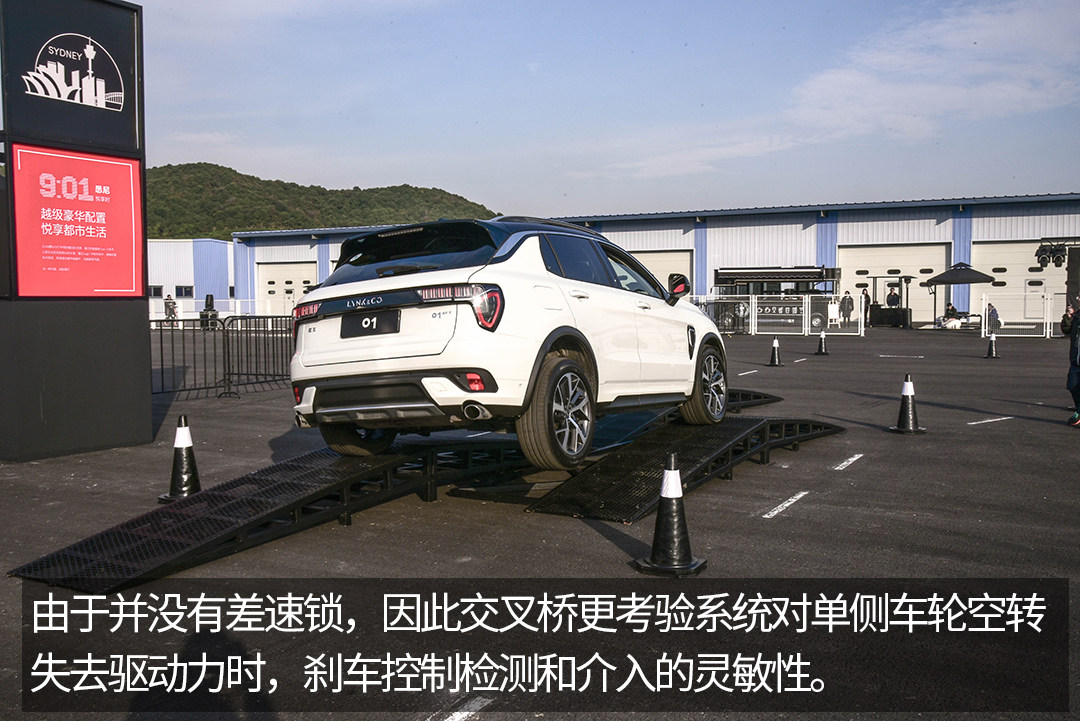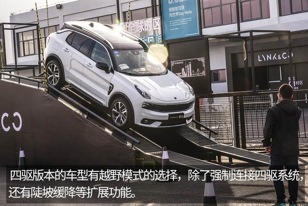 最后提一下,本次特意为领克01设置了道具驾驶项目以展现其四驱的性能。其四驱系统是来自于博格华纳的第五代Hauldex四驱系统,属于用电磁控制多骗离合器式的Real Time Awd,后差速为开放式并没有锁差结构,TCS部分是利用ESC的扩展功能实现的,这也是现在大部分城市SUV所使用的AWD结构。官方表示领克01的四驱系统前后扭矩分布可以高达50:50,加上越野模式和较高的车身离地距、接近角、离去角和通过角,能够胜任不太极限的越野需求。而在场地道具试驾中,包括更考量四驱系统反应和驱动力分布调节的较差桥、滑轮组等部分都能相当迅速通过,给对越野不太感冒的笔者也有很好的体验感受。