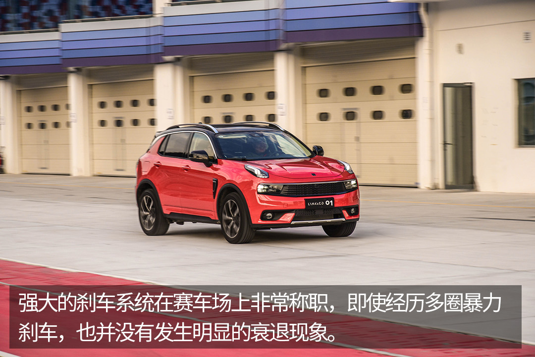 CSC5轮胎虽然说抓地力并不算很强横,但在激烈驾驶时相当容易操控。刻意把车身丢进弯内,即使轮胎在嘶叫,但在经历短暂的滑动之后会迅速找寻回抓地力,驾驶者很容易那捏到抓地和打滑之间的G点,相当有驾驶乐趣。值得一提的是领克01的优秀刹车性能,在赛道试驾中表现得淋漓尽致。刹车点可以推得非常晚,全力刹车之后刹车效率非常高且过程非常稳定,并不会有严重的跑偏。而经历三圈全力跑之后即使刹车片已经冒烟但刹车性能依然没有发生衰退的迹象。虽然作为一台SUV笔者并不期待其赛道驾驶的极限性能,不过即使驾驶领克01上赛道也能体会到驾驶乐趣,这是属于性能迷的小甜点。