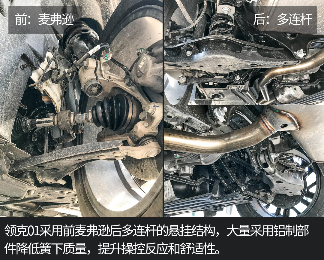 领克01和Volvo XC40使用相同的模块化平台架构,是吉利和Volvo一起共同合作开发的产物,可以灵活改变轴距和轮距,并且除了搭载传统的1.5T和2.0T发动机的纯汽油车以外,也能衍生出HEV和PHEV等混合动力车型,灵活性比较大。据悉,除了现在的2.0T低功率版本引擎以外,领克01会提供1.5T汽油机、1.5T混合动力版本(PHEV和HEV暂未明确)和2.0T高功率版本。变速箱方面,汽油版的前驱车型搭载爱信6AT变速箱,而混合动力和四驱版本车型则搭载7DCT双离合变速箱。