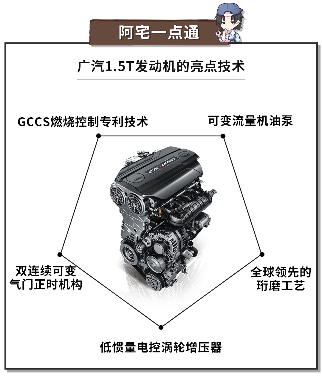 来自广汽的1.5T发动机也不是什么新鲜事物了。它的技术可以说是代表着国内的主流水平,可变流量机油泵、静音齿形链条、双质量飞轮、GCCS燃烧室控制系统专利技术与双连续可变气门正时机构都是它的拿手好戏。