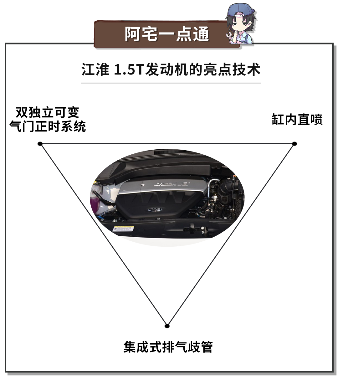 动力参数更惊人的江淮1.5T发动机曾在数据上一度碾压所有中国品牌的1.5T发动机,128Kw的最大功率、251Nm的最大扭矩,甚至要强于不少合资品牌的1.5T发动机。而且这台发动机的技术也不赖,进排气可变正时系统、缸内直喷技术以及利用了集成式理念的进、排气歧管设计,使它有着不错的动力表现。