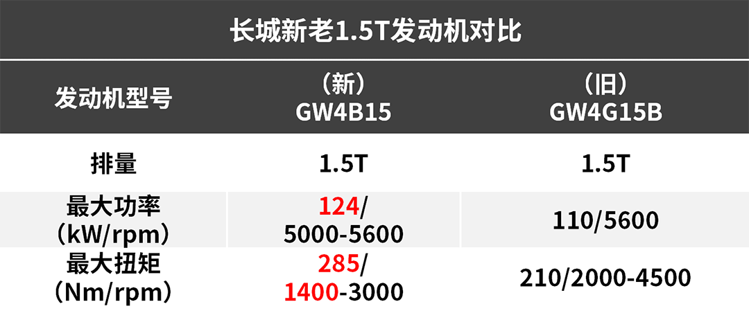 长城新老1.5T发动机对比,在数据上真的是提升了不少。最大功率为124Kw,在1400-3000的转速区间可爆发出285牛米,这样的数据甚至超过了一些合资品牌。