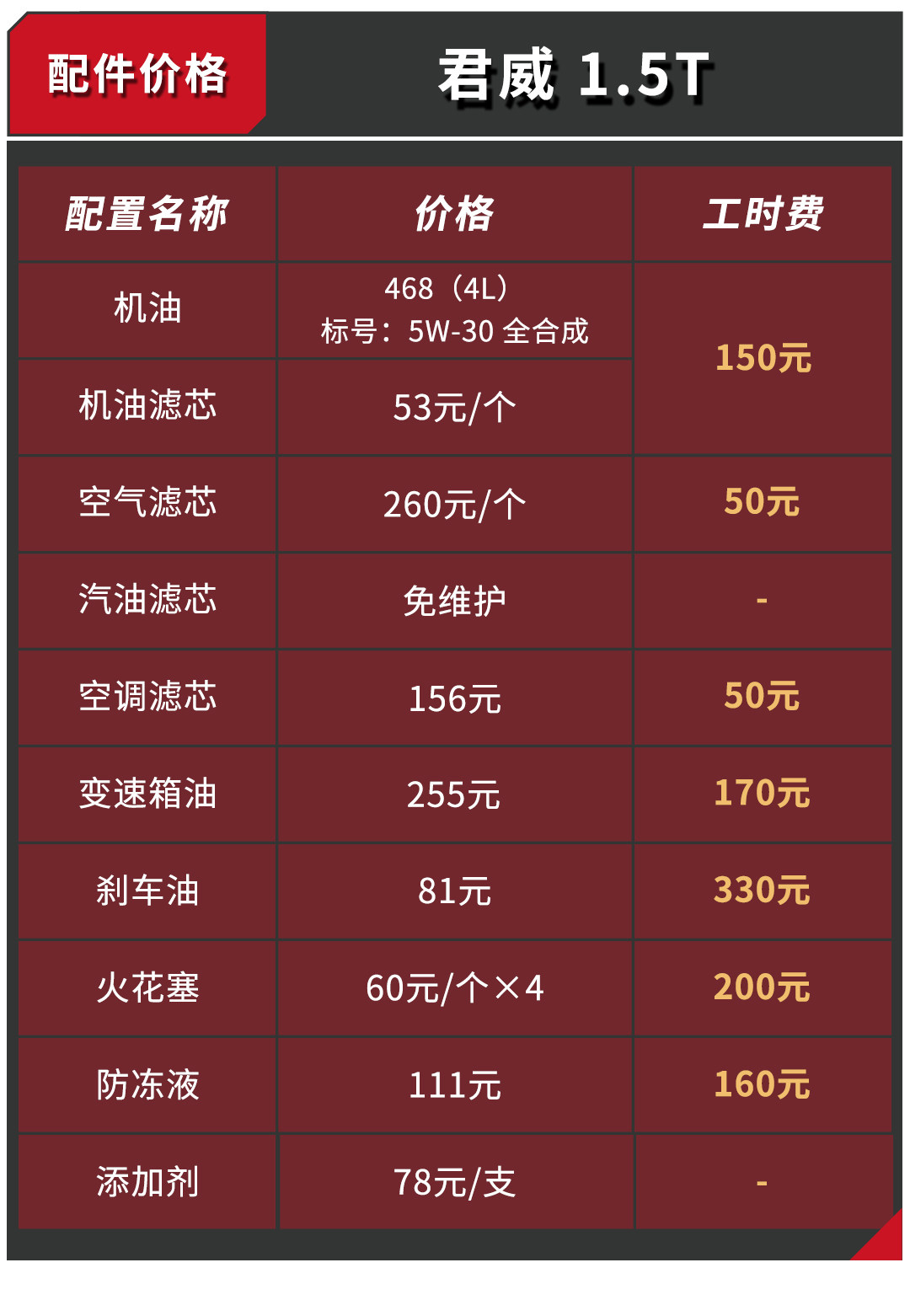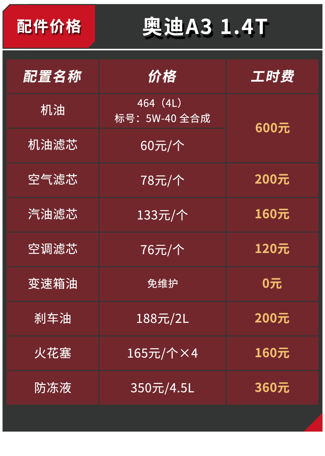 由于奥迪属于豪华品牌,工时费相对于君威也“豪华”一点,君威相对来说就优惠很多,是这个级别车型的主流水平。