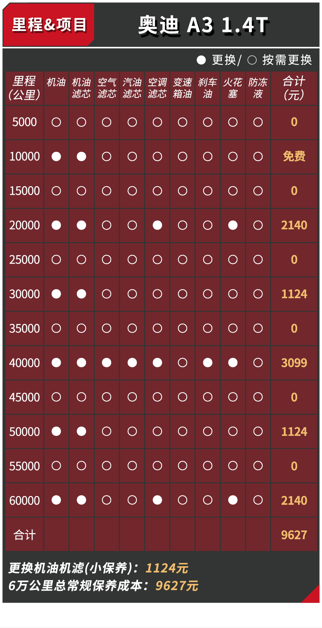虽然A3单次保养费用较高,但得益于10000公里的保养周期,6年总体下来的保养费用还是要比5000公里保养周期的君威要稍便宜一点。