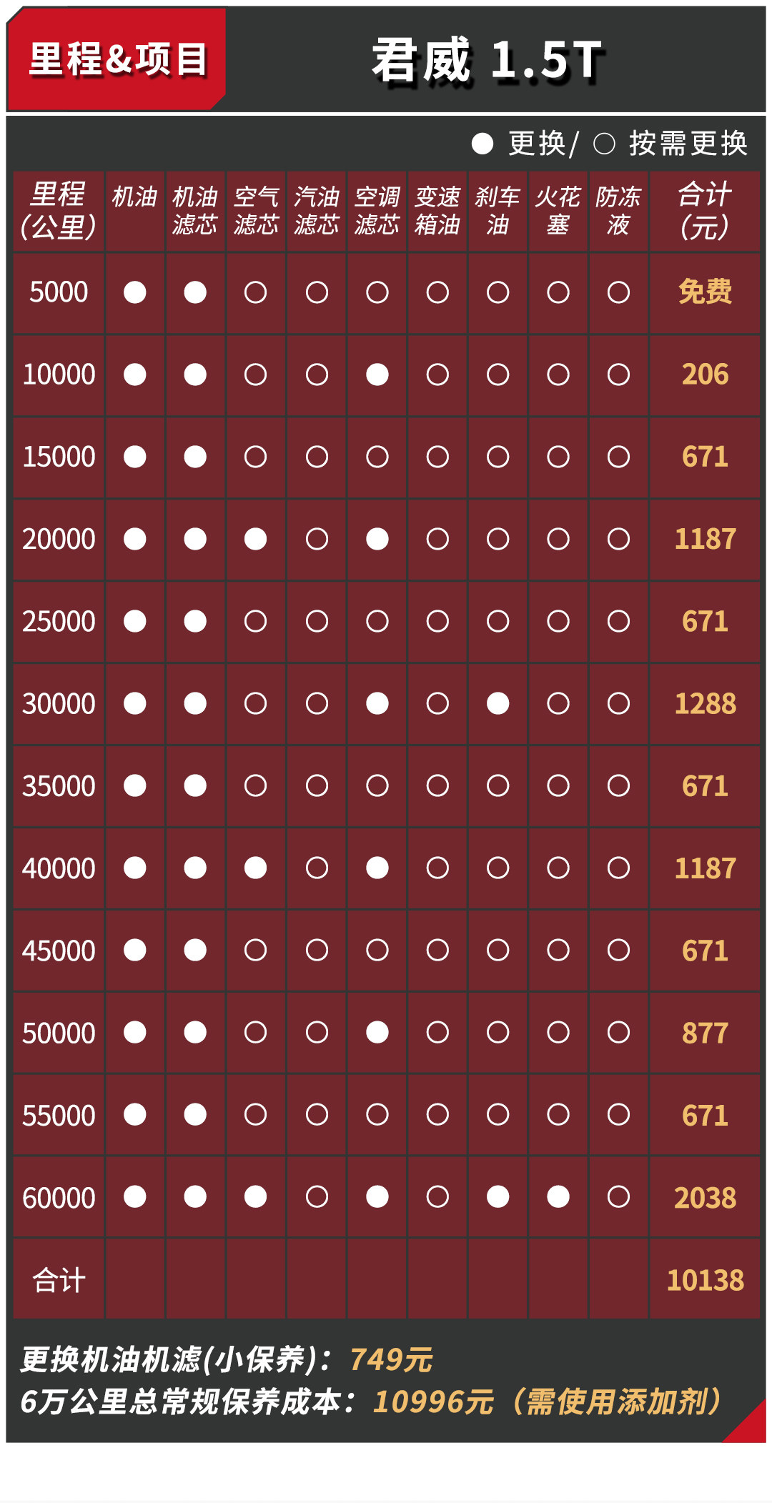 君威的三包有效期为2年5万公里,保修期3年10万公里,首保里程5000公里,保养间隔为5000公里,而且君威前期送两次免费保养,第二次保养需要更换空调滤芯,价格为206元,属于自费,但是在机油机滤上能省一笔。