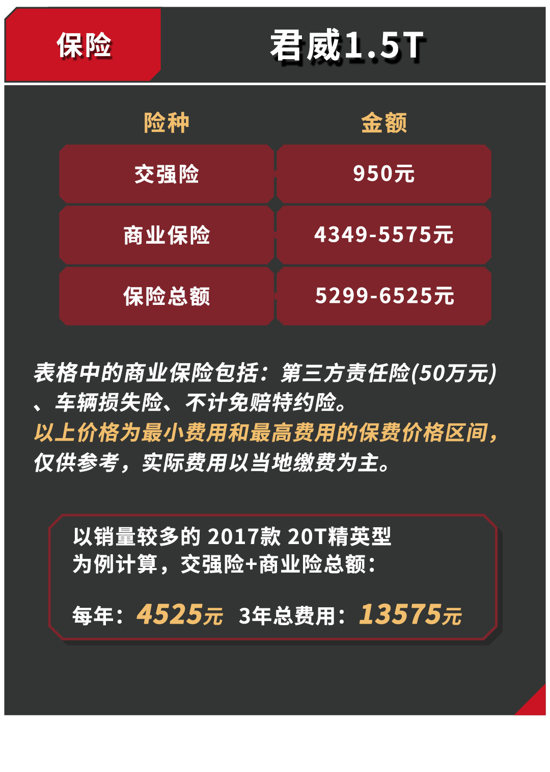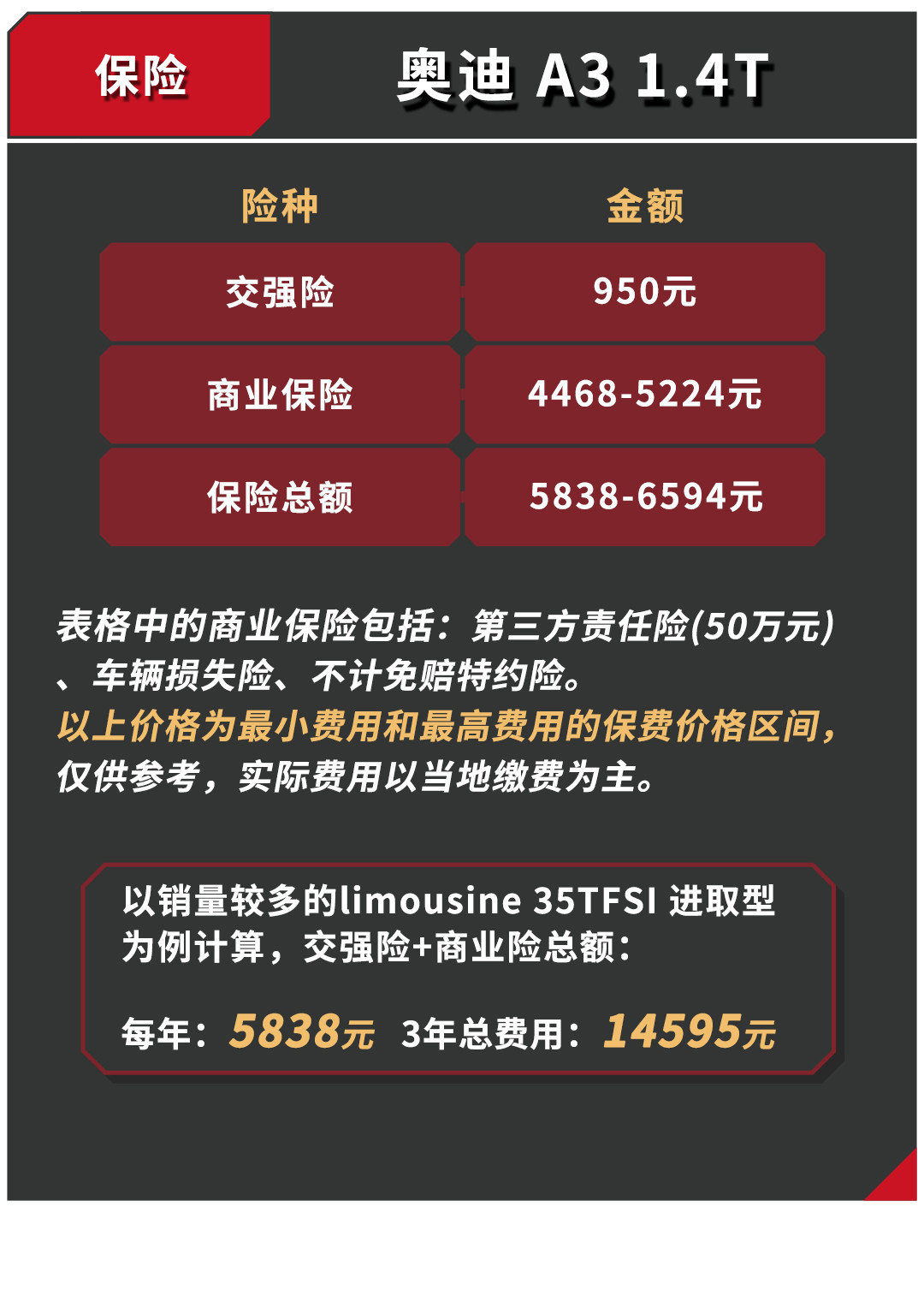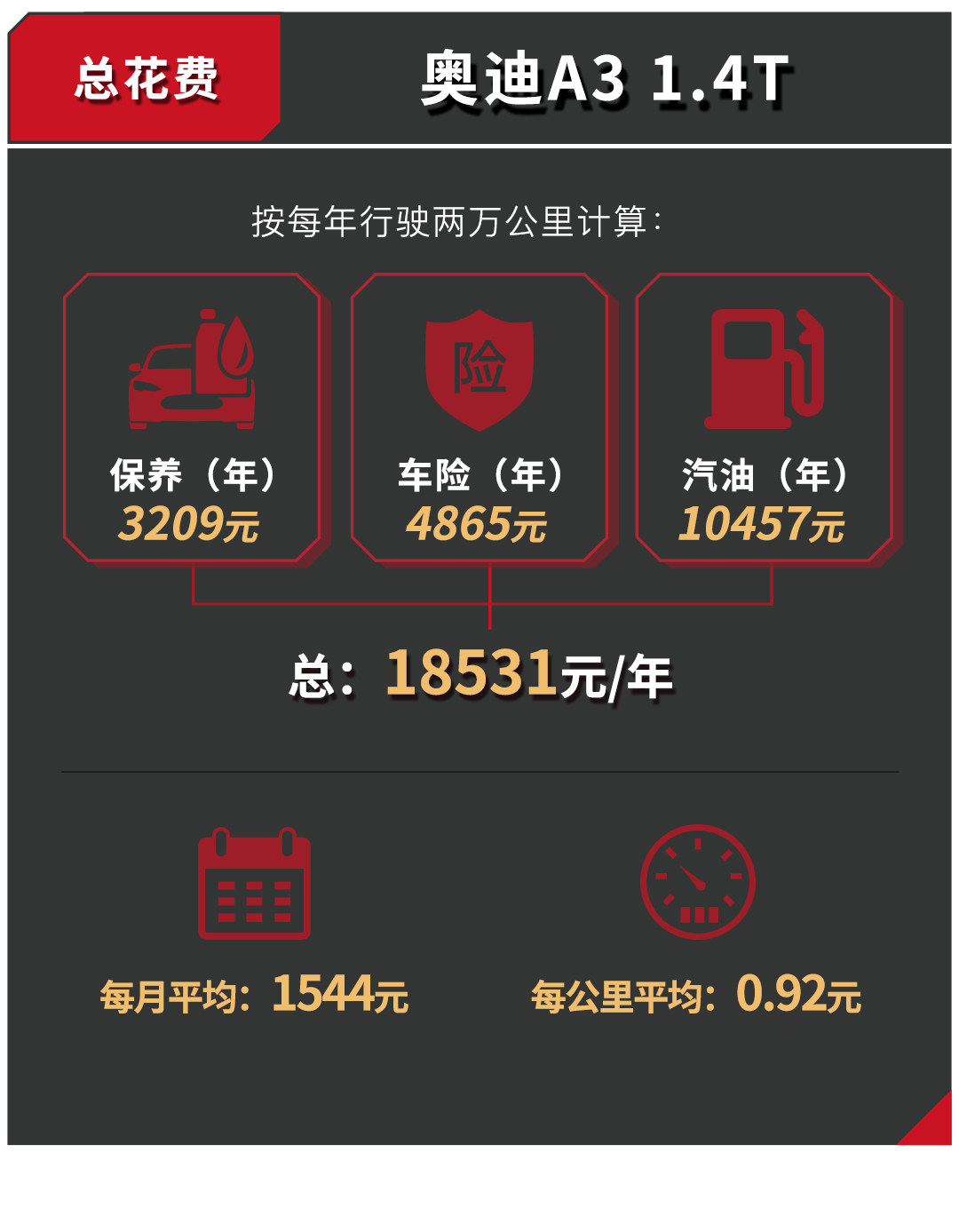 总的来说,虽然A3保养和保险相对昂贵,得益于较长的保养周期和较好的燃油经济性,分摊下来平均每年的使用成本还是要比君威要低一点,两者的后期维护费用都在合理的价格范围内。但是君威在空间上要比A3大上一个等级,具体该怎么取舍,就要看你是需要豪华品牌还是空间感。