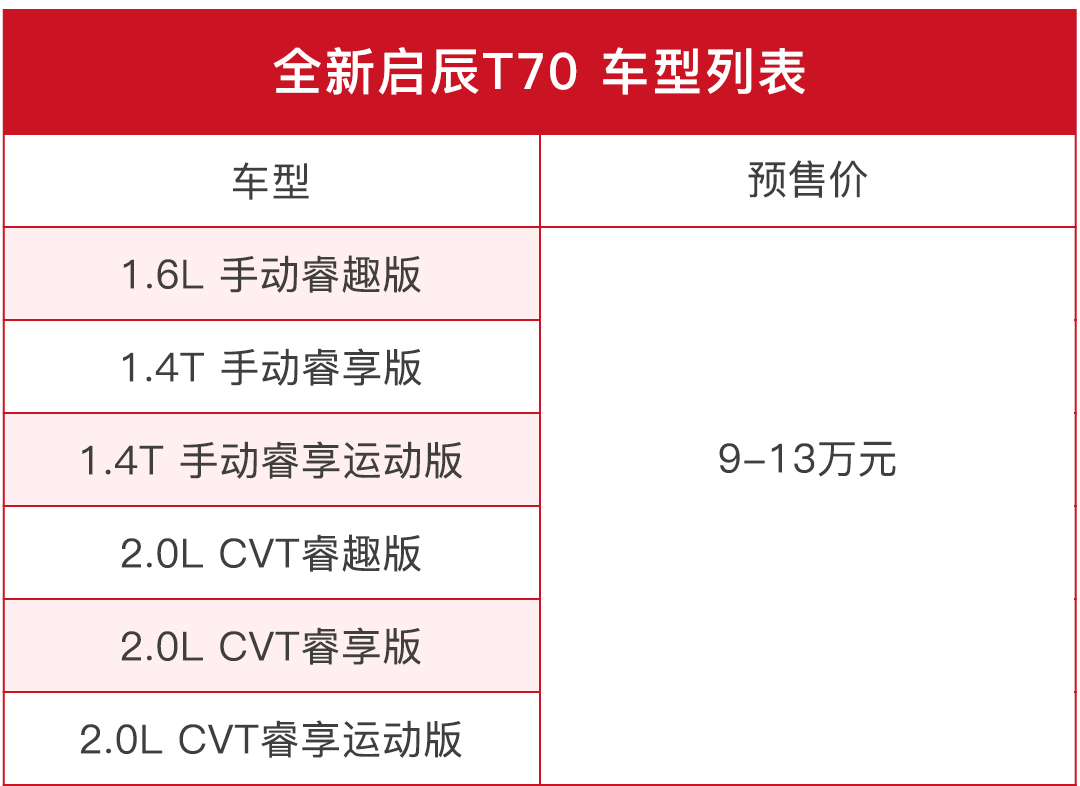 全新启辰T70将会于12月7日在重庆正式上市,目前已发布了预售价为9-13万元,将推出搭载3种动力的6款车型,这次教授试驾的车型为2.0L CVT睿享运动版(顶配),2.0L+CVT的动力组合就是日产逍客的那一套,而底盘则就重新进行了调校。