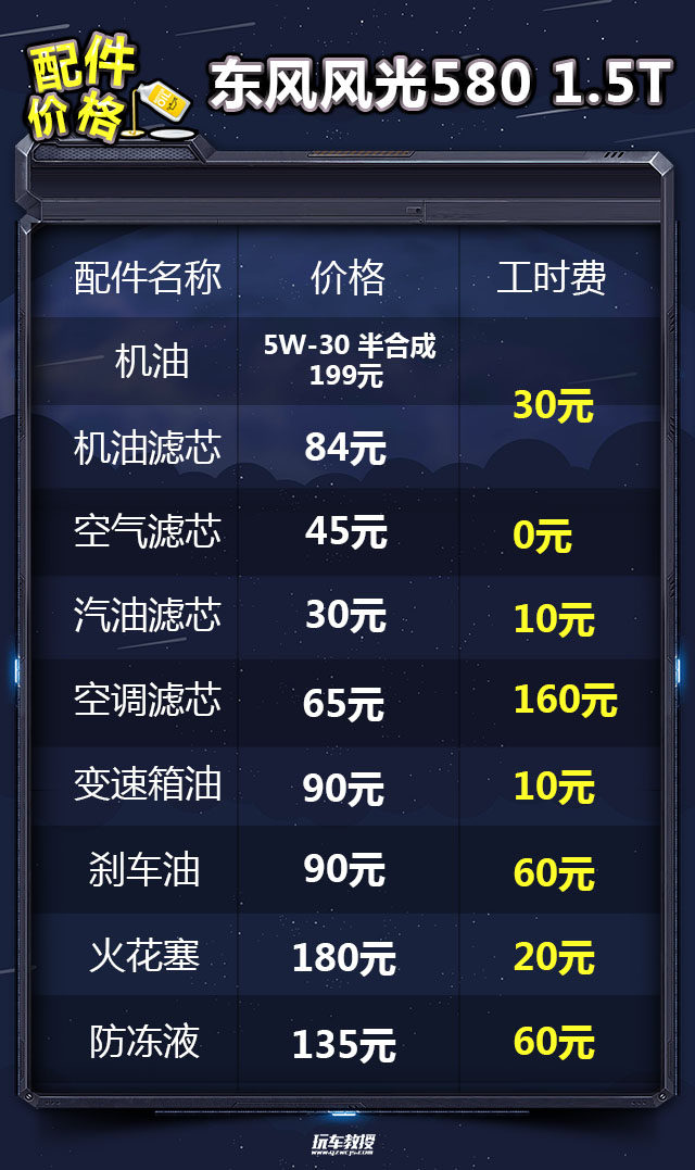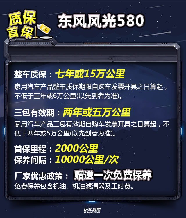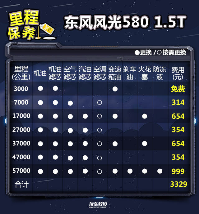 教授总结:东风风光580提供7年15万公里的超长质保,赠送一次免费保养包括工时费,还是比较厚道的。1.5T车型是它的主要动力配置,小保养和6万公里保养总费用分别是314元和3329元,整体来说还是很划算了。1.5T自动挡车型平均油耗10.11,按照6.8元/升的油价计算,每公里油耗需要0.69元,按照一年2万公里计算,1.5T车型年花费21533元,月花费1794元,如果油耗能再低一点就更好了
