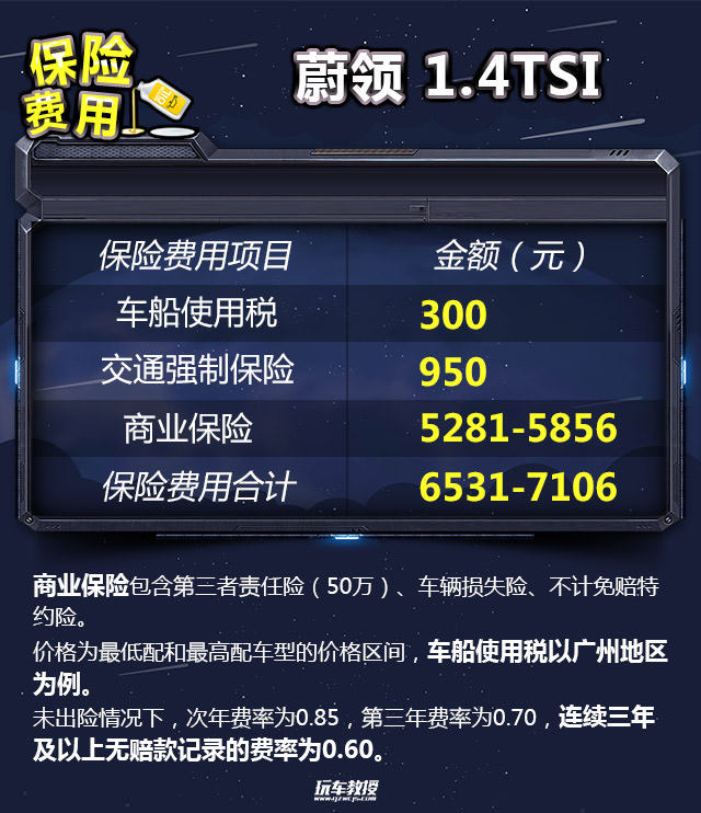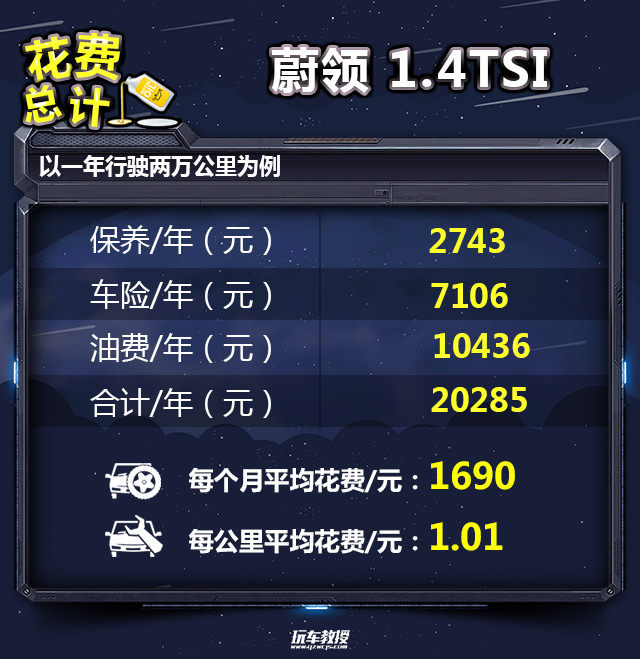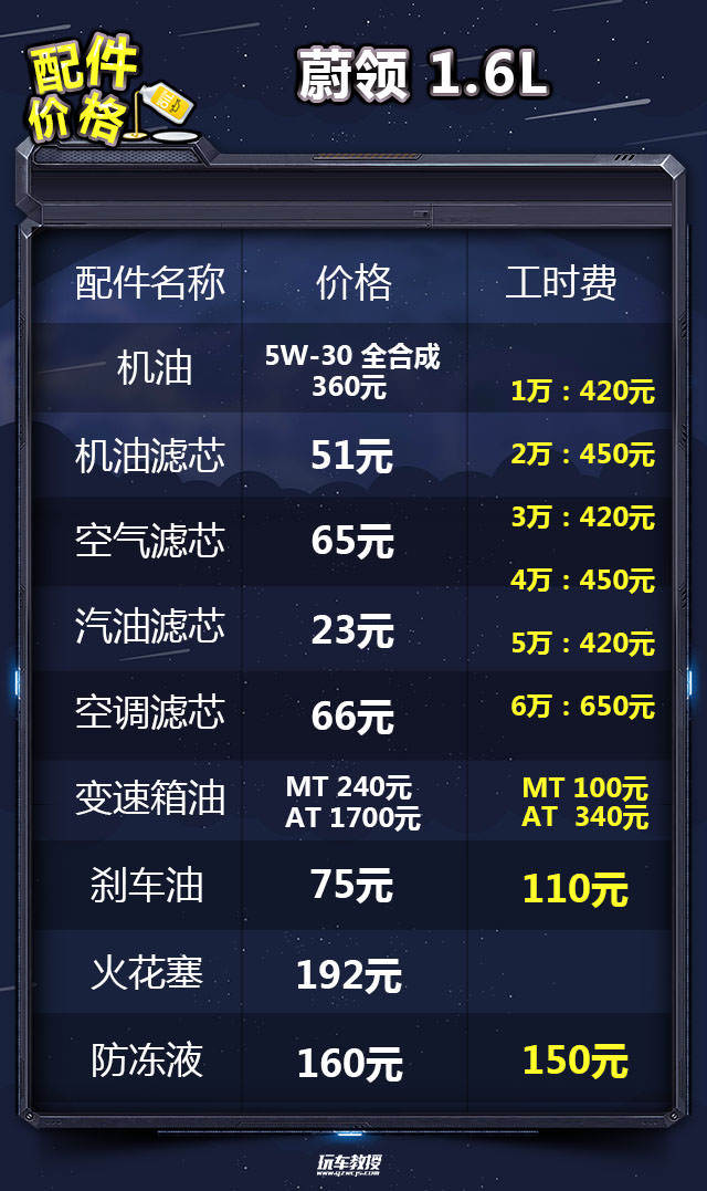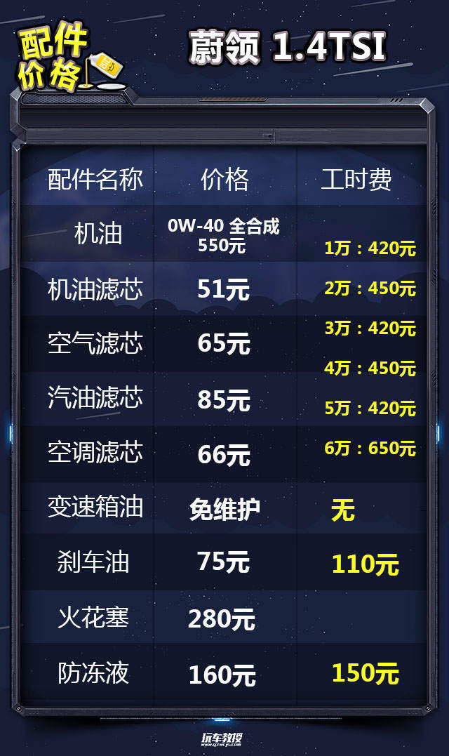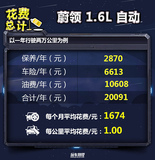 教授总结:从结果上看,蔚领的保养费用偏高,相比同平台下的宝来贵上不少。油耗方面,1.4TSI车型7.08L/km左右的耗油控制得不错,1.6L自动挡车型7.8L/km的油耗表现中规中矩。总的费用方面,1.6L手动挡年花费为17918元,月花费1493元;1.6L自动挡车型年花费20091元,月花费1674元;1.4TSI车型年花费20285元,月花费1690元。结合多方面看,教授推荐1.6L自动舒适型,厂家指导价为13.79万元。
