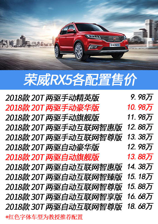 总结:荣威RX5性价比高的就两款,20T手动豪华版和20T自动旗舰版。另外,荣威RX5的2.0T虽然从性价比和实用性来说,不是很值得购买,但是国产加速在8秒出头的SUV仅此一家,如果真的纠结这点性能,荣威RX5确实是你的不二之选。