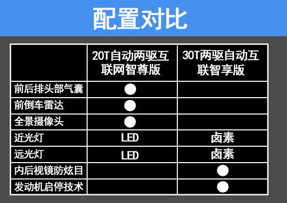 30T只有两款配置,低配16.68万顶配18.68万。贵这两万块换来一个四驱和少量配置的提升并不是很划算,尤其想到多数购买RX5的人群并不是经常越野,这套四驱系统剩下的意义就是增加重量增加油耗了。所以30T自动这方面很好选。两驱版即可。不过,难点在于,价格相近的30T的自动两驱互联网智享版和20T自动两驱互联网智尊版该怎么选呢?看下图