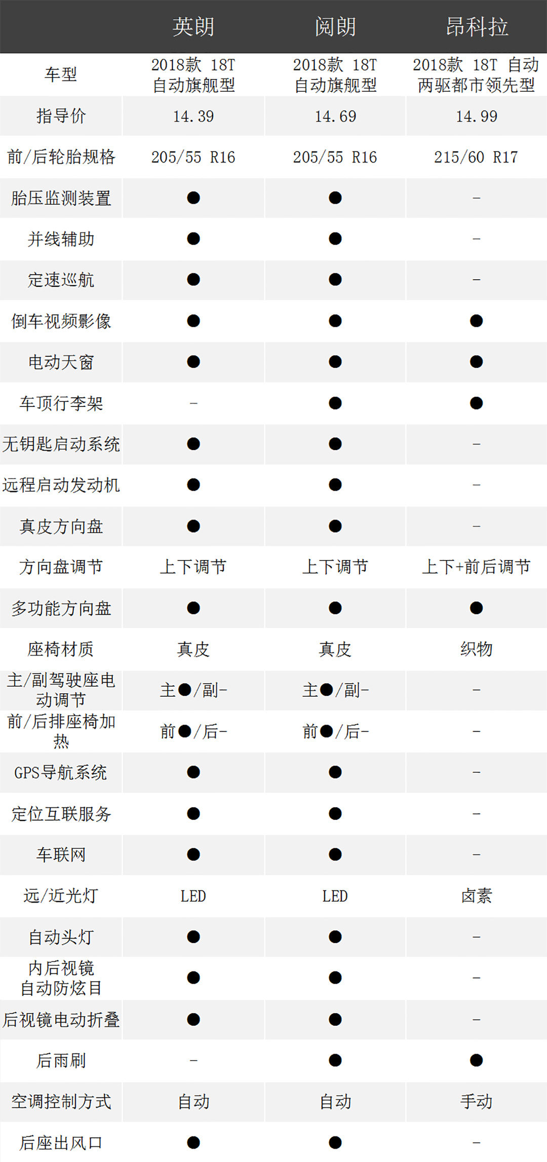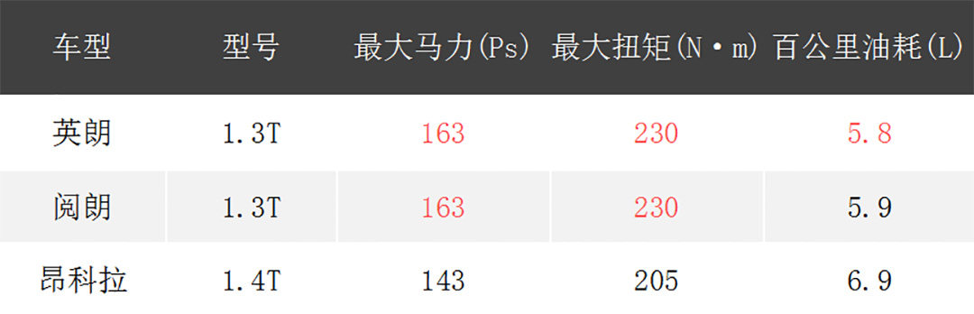 由于18款的英朗和阅朗的动力配备是一样的,分别搭载1.0T和1.3T两款三缸涡轮增压发动机,搭配的变速箱也是这个价位里比较实在的6AT,所以两车的动态表现应该很相似;而昂科拉在动力参数方面则显劣势,加上更重的车身和更大的风阻,油耗方面也只能用“呵呵”带过了。