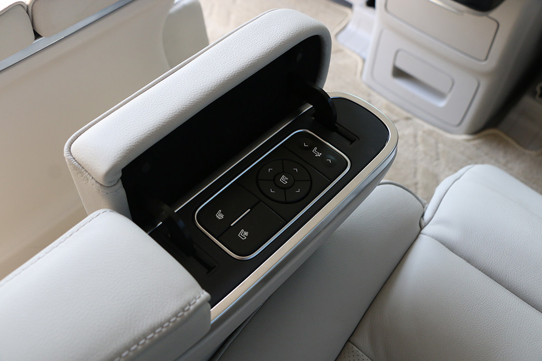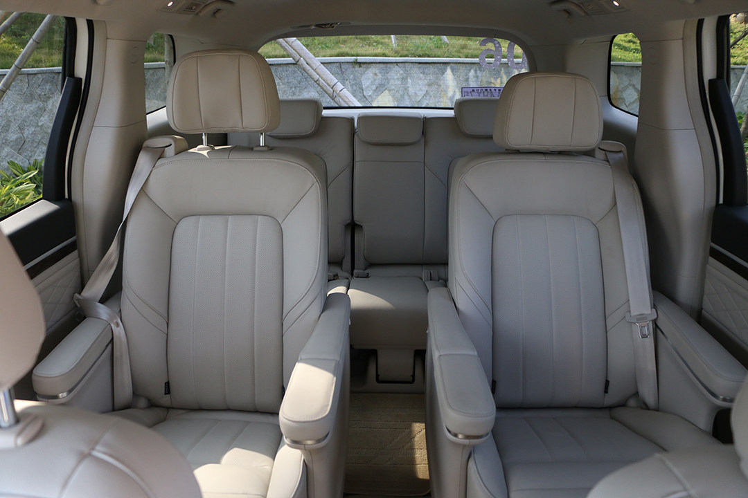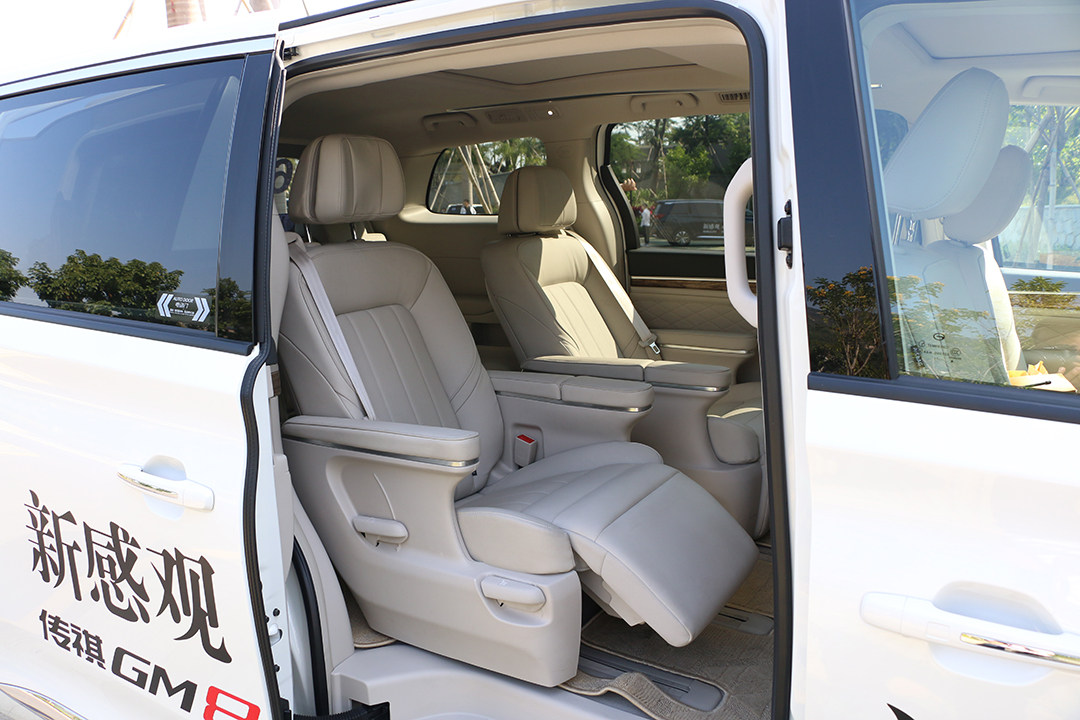 第二排座椅才是全车最重点的地方,它的扶手与座椅采用了整体式设计,造型很像平时乘坐飞机或者高铁的头等舱座椅。同时还有宽大的固定式的扶手,电动腿托,座椅自带通风、加热功能。这相对比起别克GL8的可移动式扶手设计,传祺GM8的整体包裹性更足。