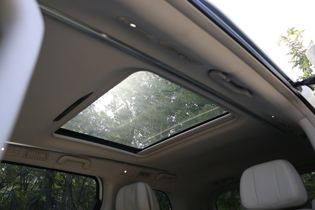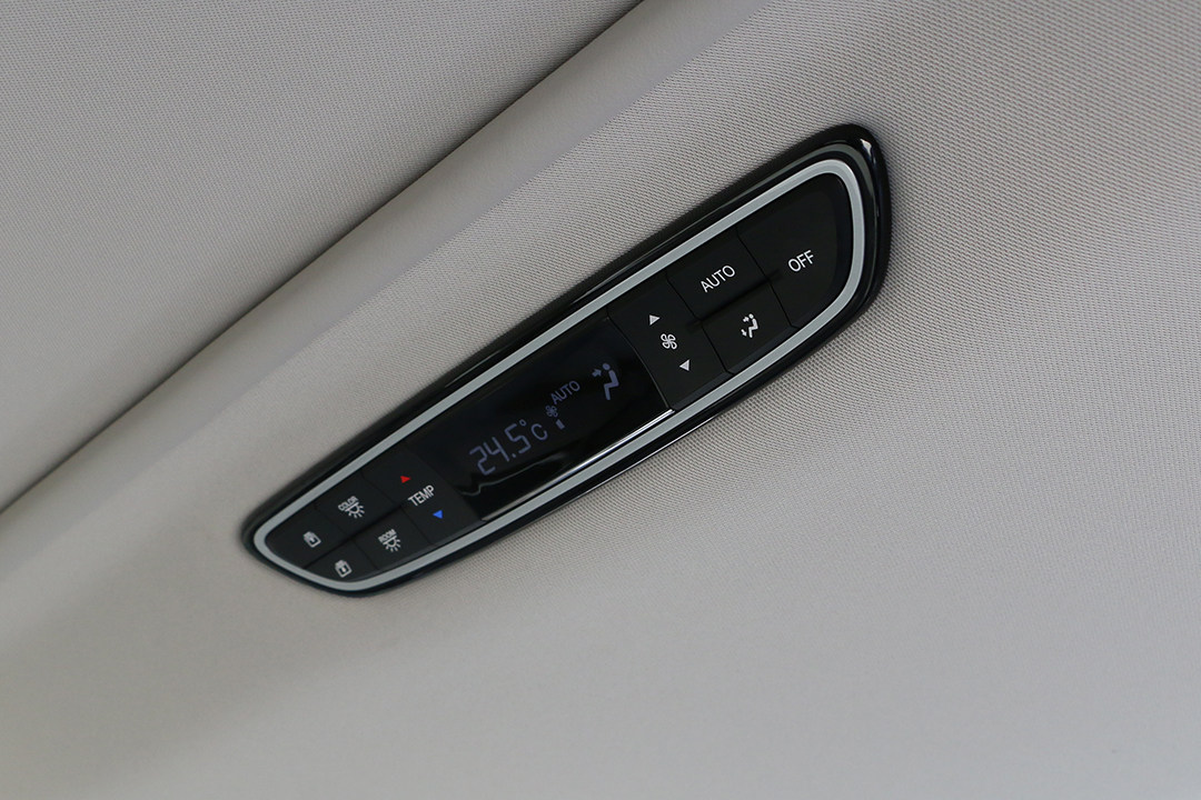 车内顶棚上方的空调出风口数量多,覆盖面积广,在第二排我们就能够调节空调的温度和挡位,同时还能开启后方的大天窗,使用非常方便。