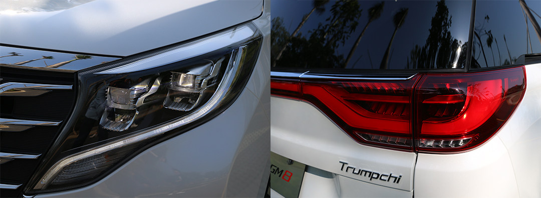 传祺GM8拥有超过5米的车长,超过3米的轴距,比GL8和埃尔法更宽的车身尺寸(1923mm)。前部大灯由4颗大型LED组成,尾部采用贯穿式尾灯,由152颗LED组成,辨识力很高。