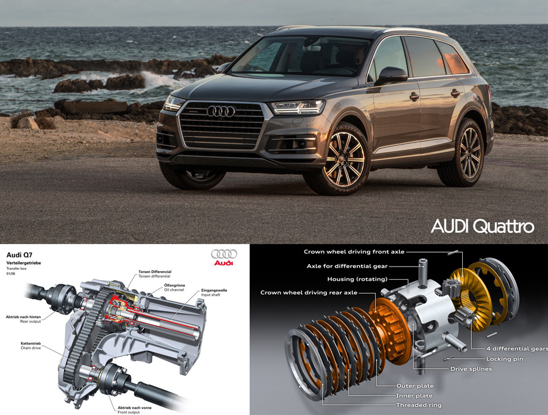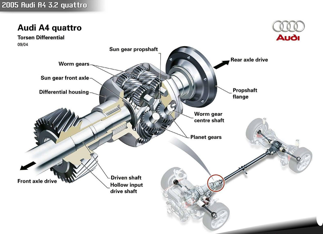 说全时四驱就不得不说奥迪的Quattro系统,其最大的特征就是使用一个托森限滑式差速器作为中央差速器,可以灵活分配前后扭矩比例。现在的Quattro则使用一个可以用离合片控制压紧力度的差速器,分配前后扭矩变得更智能。