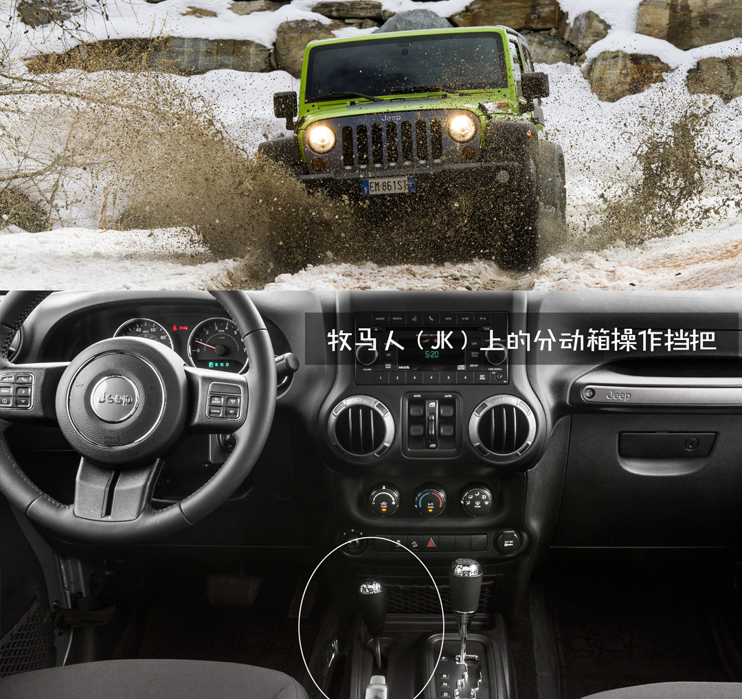 传统的越野强手牧马人上也有分动箱的挡杆,可以判断其使用分时四驱系统。