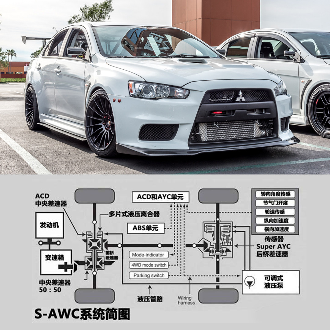 三菱上最强的四驱系统S-AWC可谓是电控多片式离合器四驱系统的最强代表之一,除了中差以外,前后驱动桥的差速器均使用多片式离合器控制,可以根据传感器获得信号并灵活控制四个车轮的扭矩输出比例。