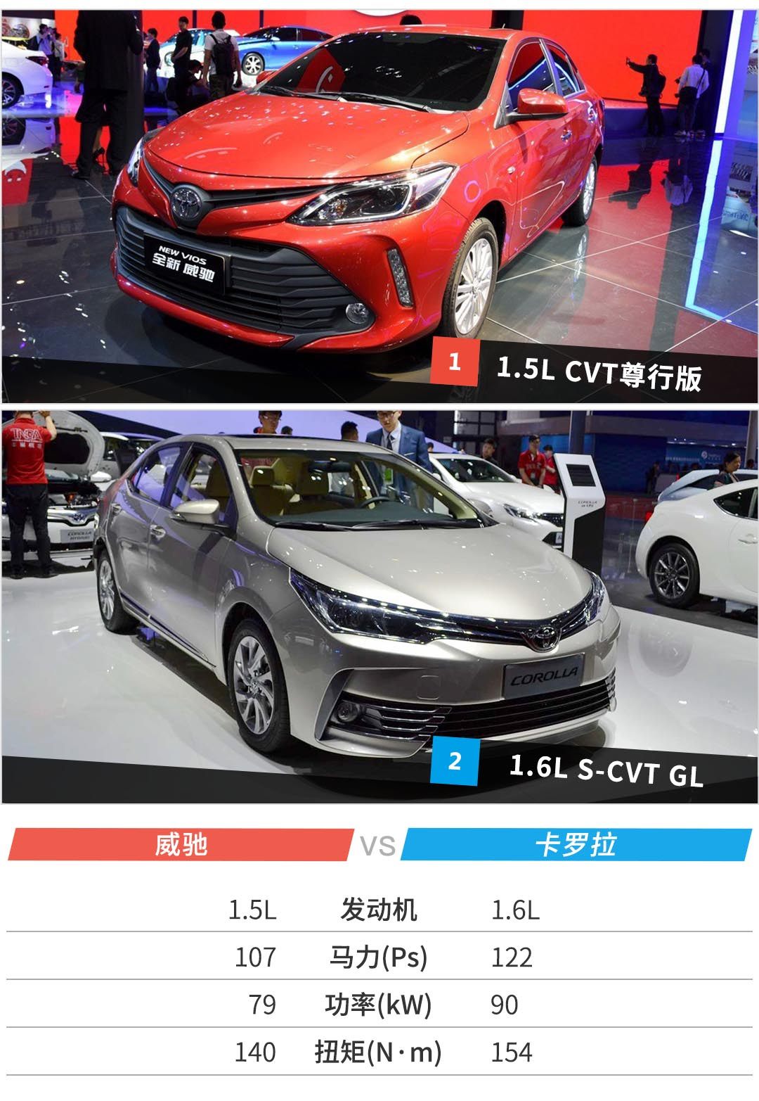 作为紧凑型车的卡罗拉显然比小型车威驰要有更大的车身空间,而在动力性能上,1.6L的卡罗拉也比1.5L的威驰有着小小的优势,这往往也是两个级别车型最直接的差距:空间和动力。