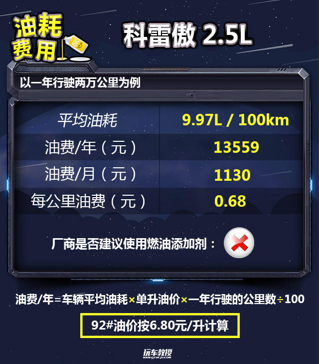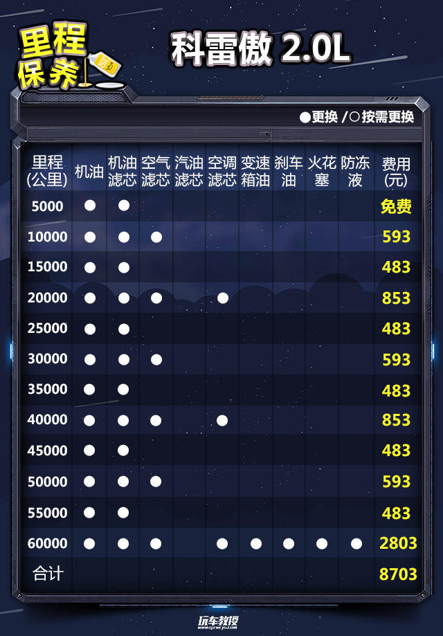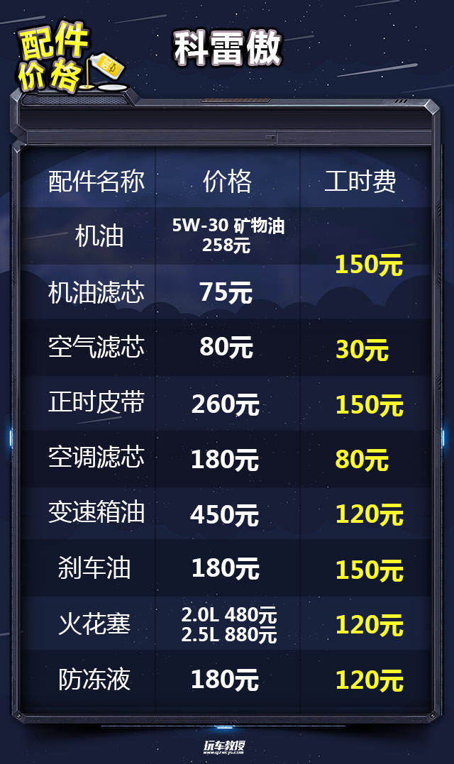 教授总结:科雷傲的保养价格相比奇骏要贵,行驶6万公里总的保养费用为2.0L车型8703元,2.5L车型9103元。以一年行驶两万公里为例,2.0L车型年花费22882元,2.5L车型年花费25156元,处于合理的范围。