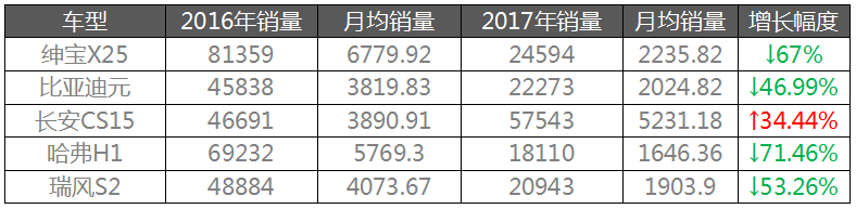 与之伴随着的则是同价位竞品的销量暴跌,比如说同价位的绅宝X25、哈弗H1、瑞风S2的月均销量相比2016年跌幅超过50%,而比亚迪元跌幅也达到了46.99%,仅有长安CS15的销量相比2016年有些微增长,不过要知道长安在5月曾经有过一次较大范围的官降,其中就包括CS15,所以CS15充其量也只能算是通过以价换量的方式捍卫住了自己的市场而已;510成为了5-7万价位SUV车型市场的霸主已经是不争的事实。
